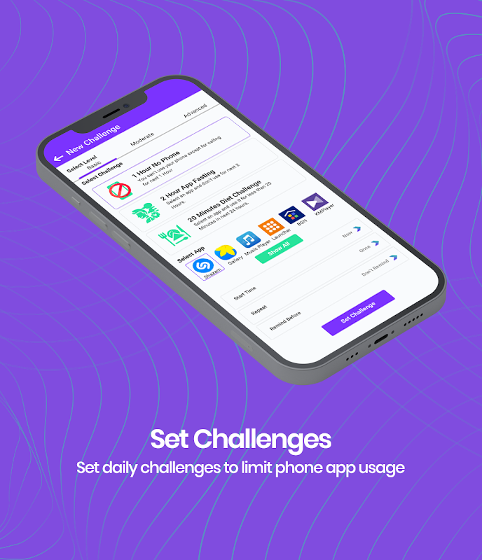 Pengawal Ketagihan Telefon membolehkan pengguna mencipta cabaran yang berbeza dengan kesukaran mudah ke sukar untuk dirinya sendiri. Pengguna boleh menyediakan cabaran yang berbeza seperti tiada penggunaan telefon selama 2 jam dsb. dan menyelesaikannya untuk mengawal ketagihan telefon mereka Anda boleh mencuba seberapa banyak cabaran yang anda mahu. Cabaran lalai turut hadir bersama-sama apl tertentu, anda boleh mencubanya dengan mudah dan mengawal ketagihan telefon anda. Anda juga boleh menetapkan peringatan untuk hari tertentu untuk mencuba semula cabaran.