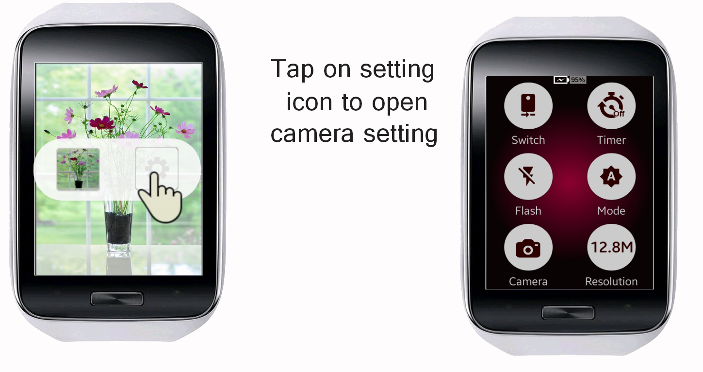 This app help Samsung Gear users can easy controll phone camera, change camera settings , take photos, videos, realtime view