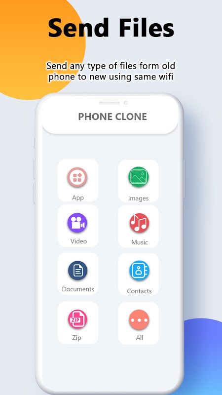 Klon telefon untuk semua aplikasi android, memudahkan perkongsian fail. Ia membolehkan telefon bimbit memindahkan fail dan memindahkan data dalam sambungan selamat. Jadi anda boleh menghantar fail besar atau sebahagian besar fail, gambar dan dokumen serta aplikasi menggunakan ciri pengimbasan QR.