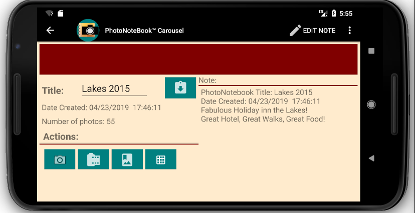 PhotoNoteBook™ is a fully functioning combined photograph and note manager for Android™ powered tablets and phones, unashamedly aimed at larger screened phones and tablet devices. PhotoNoteBook™ was designed with the needs of serious hobby photographers, students and fieldworkers foremost in mind.