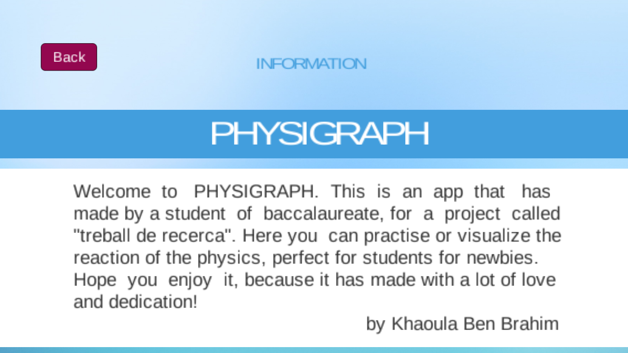 Es una aplicación realizada para el Trabajo de Recerca del curso académico 2015/2016. Ésta consiste en un simulador de la física, en la que te permite visualizar aquello que calculas científicamente. De este modo permite facilitar la comprensión y enseñanza de los conceptos más básicos de la física, perfecta para los novatos en este ámbito.