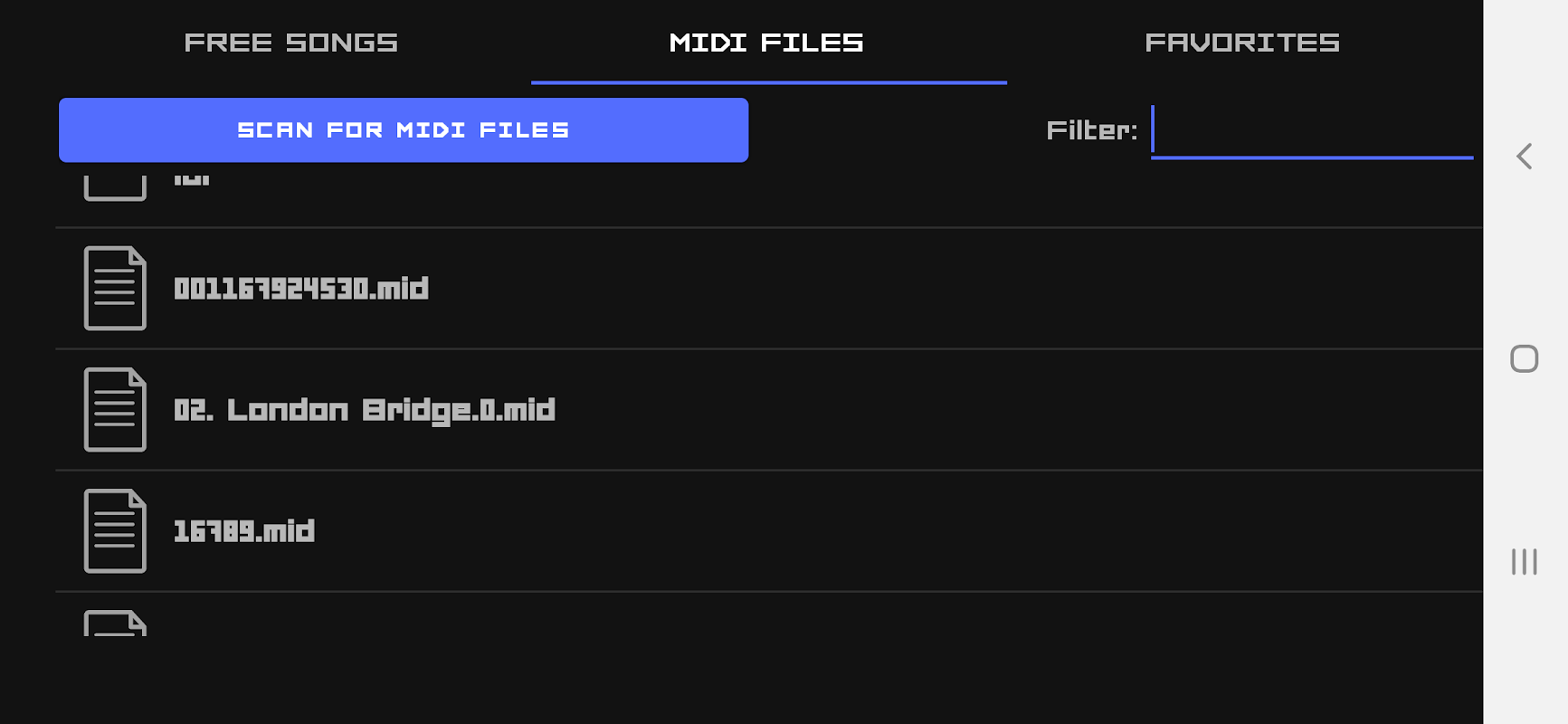 Ketahui cara memainkan lagu kegemaran anda di piano tanpa mengetahui cara membaca helaian muzik! Lagu MIDI Fail percuma termasuk untuk semua jenis pemain piano (pemula, pertengahan, maju). Aplikasi ini berfungsi dengan fail lagu MIDI dan Karaoke (Kar.) Yang popular. Hanya memuatkan fail dan bermain bersama-sama dengan nota pada piano sentuh cahaya. Alat yang sangat baik untuk pelajar Muzik dan cara yang bagus untuk pemain Beginner bersenang-senang sambil membina memori otot dan kemahiran masa.