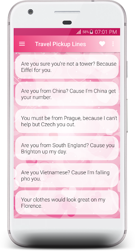Dalam aplikasi ini, kami telah mengumpul beberapa yang terbaik jika bukan talian pikap yang paling mudah yang boleh anda gunakan, dengan jari kami menyeberang dengan harapan bahawa perbualan itu akhirnya membawa masa lalu yang pertama janggal "Hello" (itulah maksudnya, betul?). Di sini kami memberi anda "Pick Up Lines - Mesej Ganjaran".