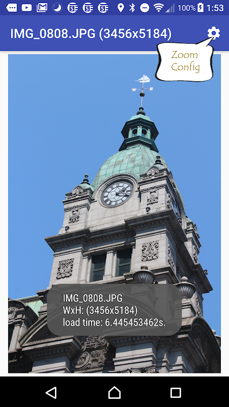 Pic Viewer can be used as the default image viewer on Android. Pic Viewer has a basic Gallery view of image thumbnails, and a button that allows you to cycle through the three common image directories on your device. When a image thumbnail is clicked on a configurable Zoom image detail window will come up with that image (pinch-in/pinch-out gesture aware). In the Zoom detail view when you click the configure gear in the toolbar some settings for the zoom view will be displayed and a set of image rotate buttons will be toggled in the display. Pic Viewer allows you to zoom the image around 8x (compared to most apps 2-3x zoom). The app can be associated with your "Share As" , "Send To", or File Manager "Open As" as the default image viewer.