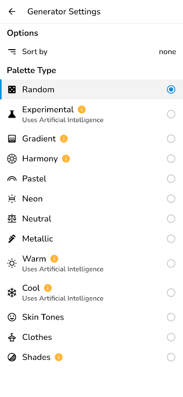 - Pilih daripada pelbagai mod penjana: mod penjana rawak, kecerunan, pastel, neutral, metalik, dikuasakan AI (kecerdasan buatan) dan banyak lagi.
