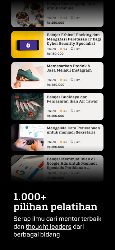 Perlukan peluang kerjaya bersama aplikasi Pintar. Temukan 1.000+ kursus dari 65+ mitra lembaga pelatihan sertifikasi nasional. Semua kursus mengikut tuntutan industri dan disampaikan oleh mentor-mentor terbaik dari pelbagai bidang.