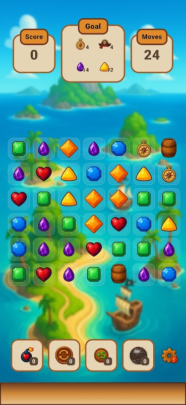 - 500 relaxing match-3 levels with pirate gems, coins, and treasure chests