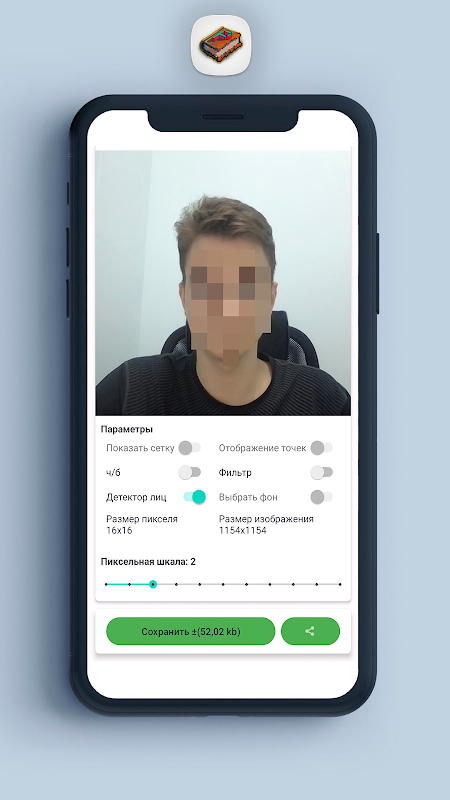 Pixelate it - ialah alat yang berguna untuk menukar imej anda kepada seni piksel. Pilih imej daripada peranti anda, laraskan saiz blok, gunakan grid, penapis titik dan klik butang "Simpan" atau "Kongsi".