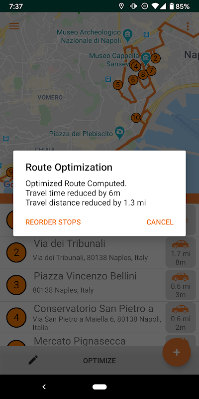 Buat senarai berhenti dengan pantas, dan lancarkan navigasi. Menyusun atau mengoptimumkan pesanan urut berhenti secara manual. Memaparkan anggaran masa perjalanan dan jarak ke setiap perhentian. Kongsi senarai dengan orang lain melalui e-mel.