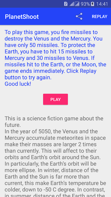 Panduan: Untuk bermain permainan ini. anda api peluru berpandu untuk memusnahkan Venus dan Mercury. Anda hanya mempunyai 50 peluru berpandu. Menyentuh skrin untuk menembak. Untuk melindungi Bumi, anda perlu untuk memukul 15 peluru berpandu untuk Mercury dan 30 peluru berpandu untuk Venus. Jika peluru berpandu melanda kepada Bumi, atau Bulan, permainan berakhir dengan segera. Klik butang Replay untuk mencuba lagi.