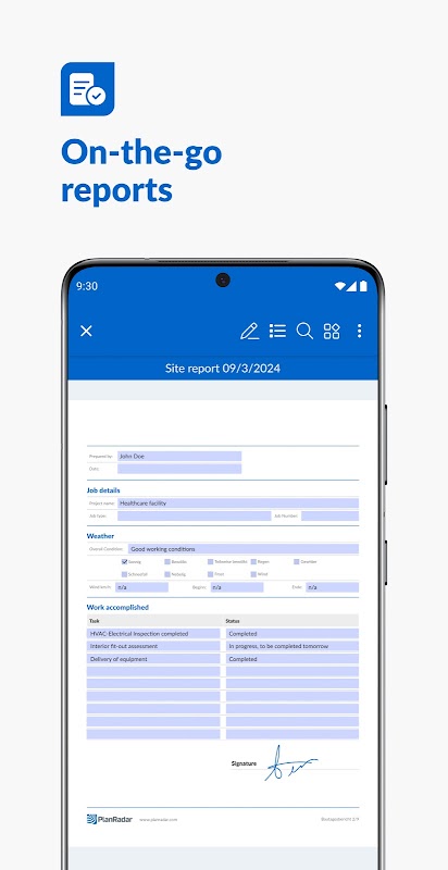 Buat laporan PDF atau Excel yang terperinci dan boleh disesuaikan sepenuhnya dan eksport diari tapak pembinaan anda, senarai halangan terperinci atau keseluruhan dokumen penyerahan hanya dalam beberapa klik. Pelaporan yang cekap menjimatkan anda daripada menduplikasi kerja di pejabat selepas menyelesaikan pemeriksaan tapak anda.