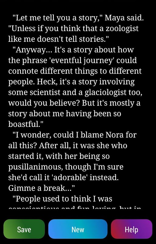 The logic of the app is to both provide a format compatible with narrative expectations (in other words: to create a text that could be plausibly seen on the back cover of a real book) and, at the same time, to allow the writer/user to fill in the details using his or her imagination. The app cannot create a complete detailed plot; it can merely allow the writer to come up with ideas.
