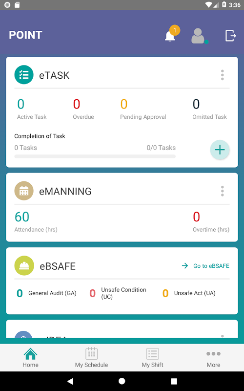 POINT boleh diakses di kedua-dua platform web dan mudah alih yang merangkumi skop seperti di bawah termasuk enam modul (eMANNING, eTASK, eGTASK, eLOG, eBSAFE dan eIDEA):