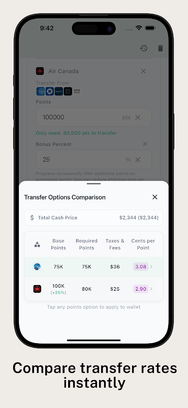 Bukan hanya mata—termasuk peratus pulangan tunai, cukai, yuran dan bonus pemindahan. 50,000 mata + $200 dalam yuran berbanding 70,000 mata + $5? Pointsuno mengira semuanya.