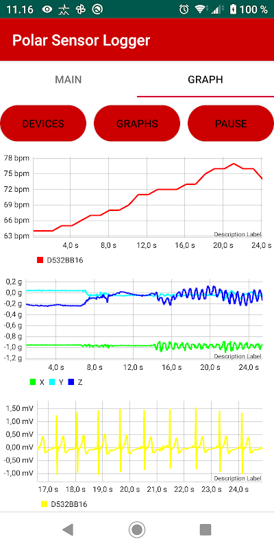 Aplikasi ini boleh digunakan untuk log HR dan biosignal mentah lain daripada Polar H10, OH1 dan Verity Sense -sensors. Ia menggunakan Polar SDK (https://www.polar.com/en/developers/sdk) untuk menyambungkan penderia.
