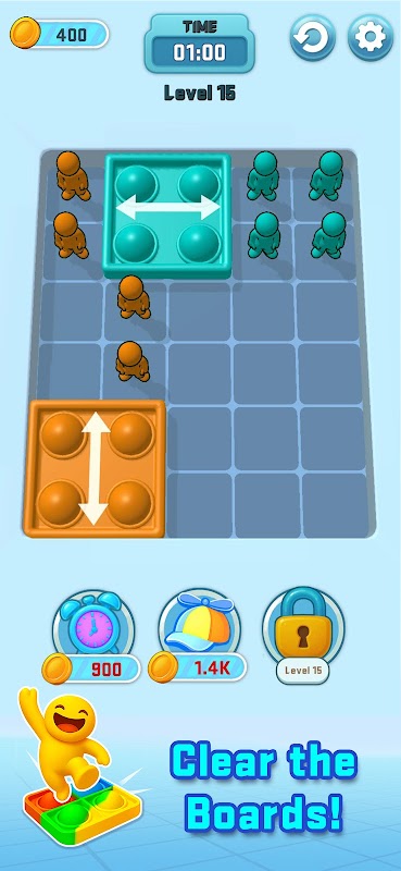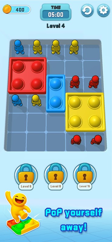 Permainan teka-teki di mana manusia berwarna-warni melompat melintasi blok untuk meletuskan sfera "Pop It"!