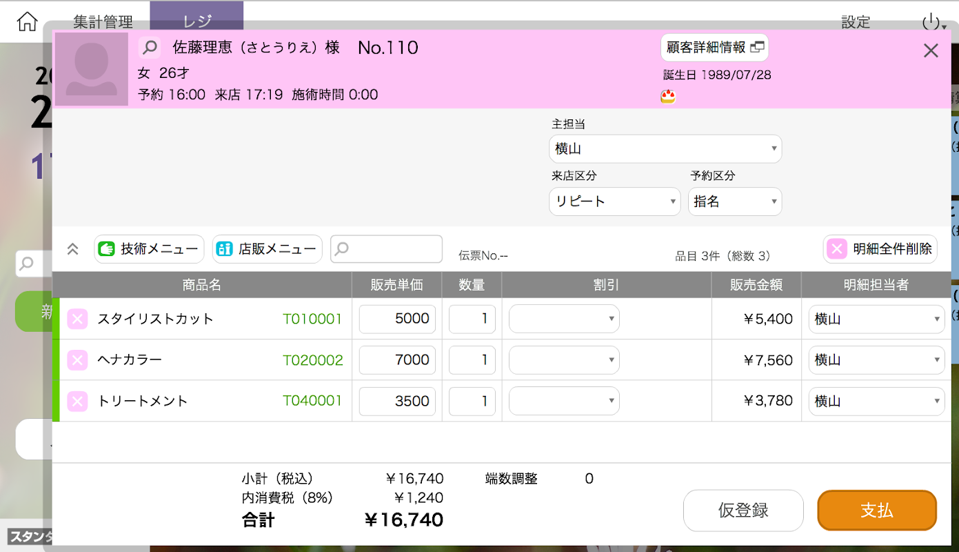 会計明細画面はフルスクリーンでの表示が可能です。他のお客様の伝票や情報が表示されないので、施術前にお客様とご一緒に画面での合計金額の事前確認をしたり、セット面でのお会計ができます。