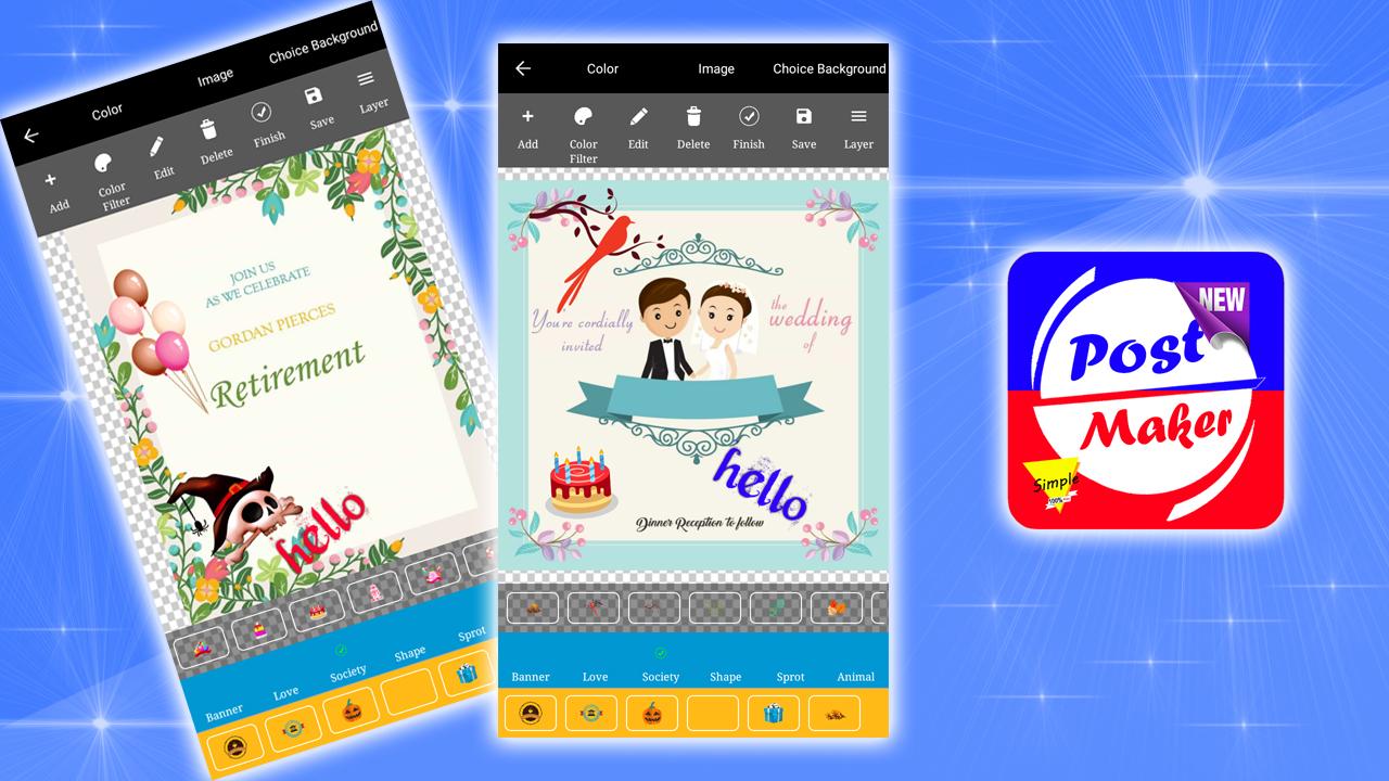 The "Post to Social Media (Crop & Swap photo)" application provides hand-selected backgrounds, textures, stickers, and special fonts for creating banners, posters, and flyers to create your own. Advertise; make cover and banners like the real ad experts.