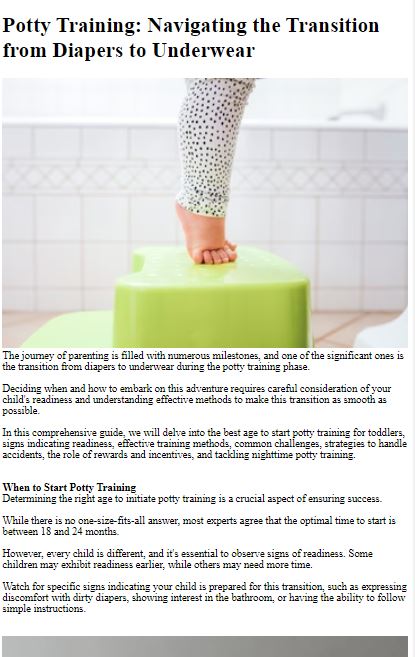 Sediakan anak anda untuk salah satu peristiwa penting dalam zaman kanak-kanak dengan Tutorial Potty Training kami. Panduan komprehensif ini menyediakan ibu bapa dengan pengetahuan, teknik dan petua untuk mengajar anak-anak mereka cara menggunakan tandas dengan berkesan. Daripada mengenali tanda-tanda kesediaan untuk mengendalikan kemalangan dengan kesabaran, tutorial ini menawarkan nasihat praktikal untuk menjadikan latihan tandas sebagai pengalaman yang positif untuk anda dan anak anda.