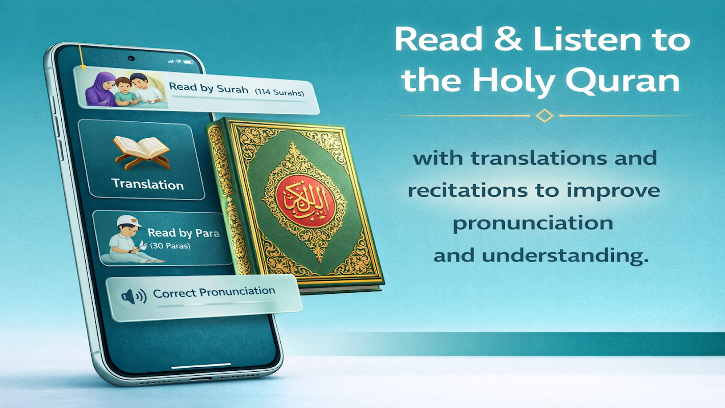 Bacalah Al-Quran pada bila-bila masa dengan teks dan terjemahan Arab yang jelas. Dengarkan bacaan yang indah untuk meningkatkan sebutan dan pemahaman. Doa harian, Azkar dan Hadis yang sahih disertakan untuk menyokong rutin rohani anda di luar waktu solat.