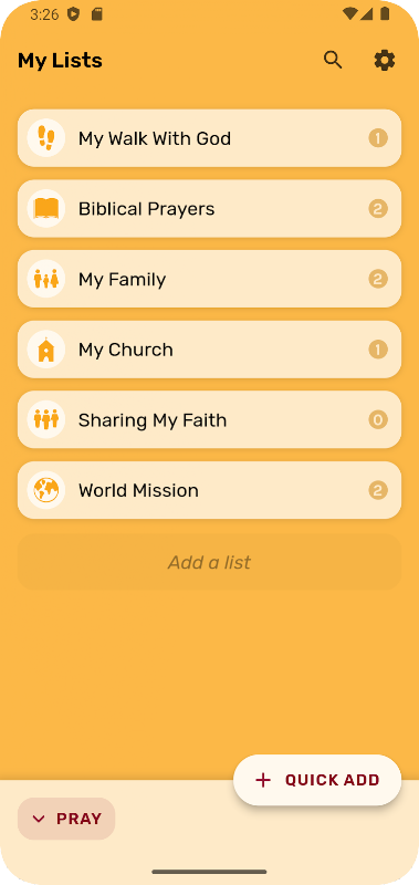 Setiap hari, Doa Mate akan memilih seseorang atau topik yang anda masukkan dari setiap kategori utama anda (mungkin "Keluarga saya" atau "Kumpulan kecil saya di gereja") dan menunjukkannya kepada anda sebagai rangkaian kad indeks - kemudian sapu antara mereka untuk berdoa.