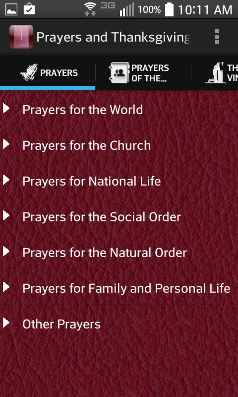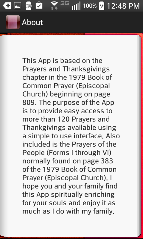 App ini adalah berdasarkan Selawat dan Doa bab dalam 1979 Kitab Doa Bersama (Episcopal Church) bermula pada halaman 809. Tujuan App adalah untuk menyediakan akses mudah kepada lebih daripada 120 Doa dan Thankgivings didapati menggunakan yang mudah untuk menggunakan antara muka . Turut termasuk adalah Doa Rakyat (Borang I melalui VI) biasanya terdapat pada muka surat 383 daripada 1979 Kitab Doa Bersama (Episcopal Church). Saya berharap anda dan keluarga anda mencari ini App memperkaya rohani untuk diri anda dan menikmati ia seberapa banyak yang saya lakukan dengan keluarga saya.