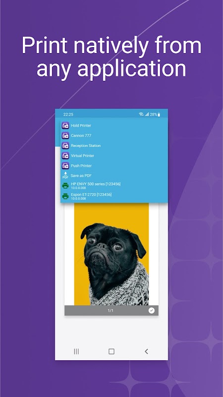Cara kerjanya: Dari dalam aplikasi apa pun, lancarkan pekerjaan cetak menggunakan fungsi Share dan kemudian pilih PrinterLogic. Pilih pencetak yang ada dan pilih Cetak. Tugas cetak diproses pada peranti mudah alih anda dan dihantar terus ke pencetak.