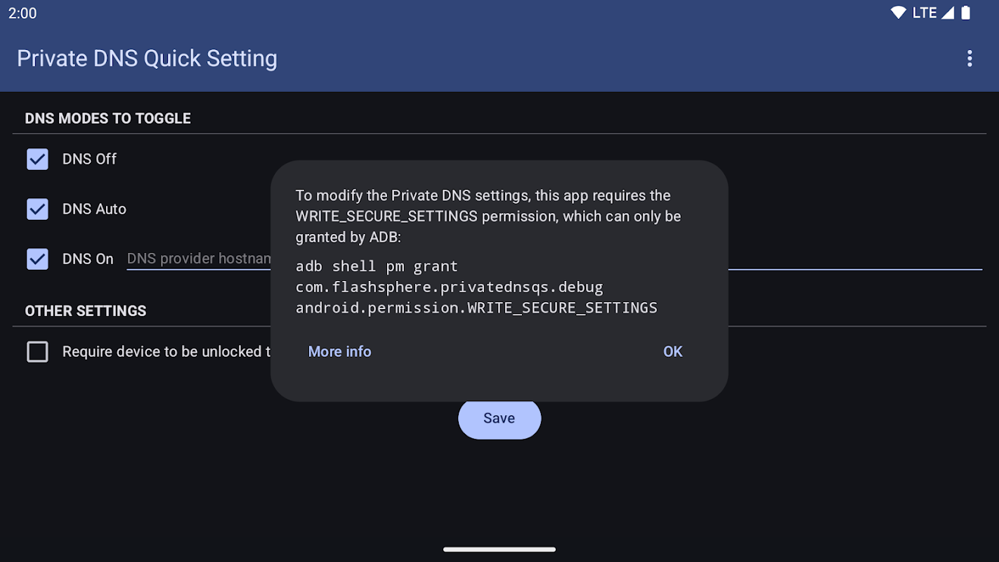 Lihat https://private-dns-qs.web.app/help tentang langkah-langkah untuk menggunakan ADB untuk memberikan kebenaran.