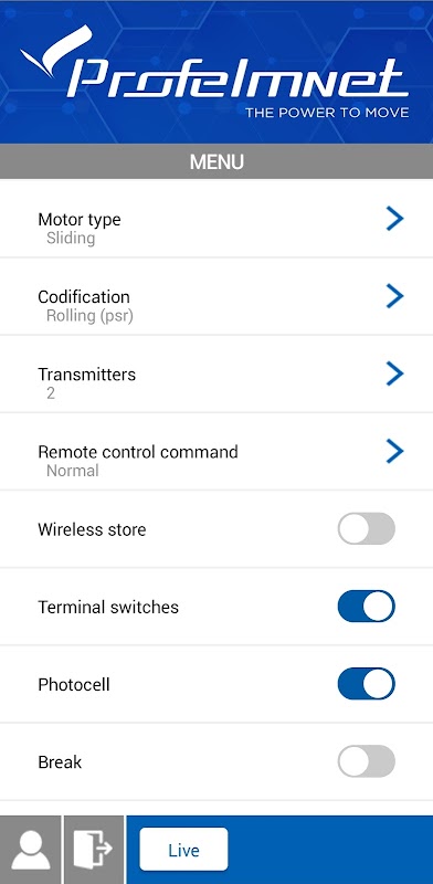 Pra-syaratnya adalah INTERNET dan BLUETOOTH pada telefon bimbit pengguna, pengguna terlebih dahulu membuat akaun peribadinya dalam aplikasi, yang digunakannya untuk menyambungnya. Selepas itu, pengguna mengklik butang Login dan melihat senarai papan kawalan PROFELMNET BLUETOOTH yang ada. Memilih automasinya, memasukkan kod PIN papan kawalan dan menyambungkannya.