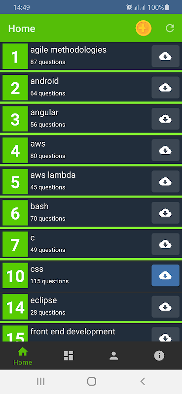 Aplikasi ini mengandungi lebih daripada 58 kategori berbeza topik berkaitan pengaturcaraan (java, android, PHP, javascript) untuk diamalkan.