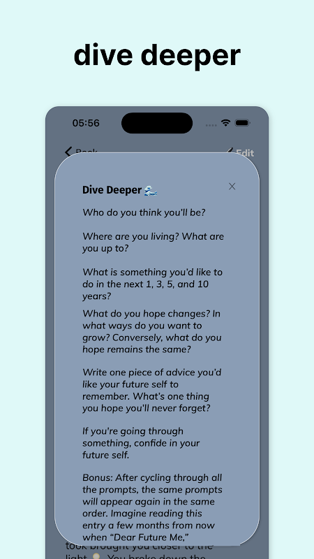 Selain itu, apl kami menggabungkan teknik kerja bayangan untuk menyelidiki kesedaran diri dengan lebih mendalam. Terlibat dalam kerja bayangan melalui gesaan khusus yang membimbing anda dalam meneroka aspek tersembunyi keperibadian anda. Hayati kuasa kerja bayangan lima kali seminggu untuk meningkatkan amalan jurnal dan pertumbuhan peribadi anda.