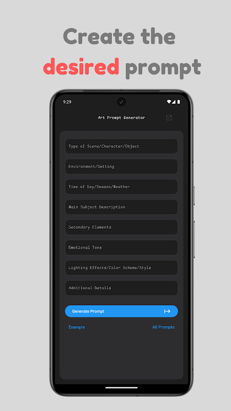 Skrin Utama: Mulakan perjalanan kreatif anda dengan skrin utama dinamik yang menampilkan kategori, pemilih gesaan rawak, jubin penjanaan segera dan akses mudah untuk meneroka semua kategori. Ia adalah hab sehenti anda untuk inspirasi tanpa henti!