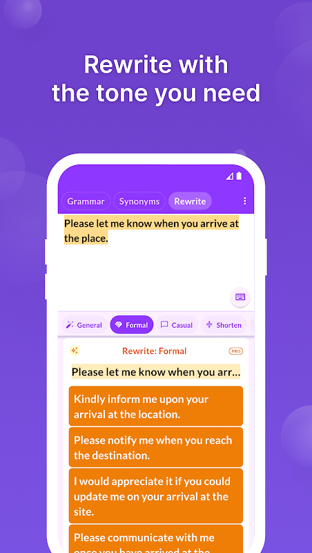 • Tulis semula dengan AI – Betulkan dan temui cara baharu untuk mengungkap semula ayat. Dapatkan cadangan parafrasa yang pelbagai untuk meningkatkan gaya dan kreativiti anda. Selain itu, tulis dalam mana-mana bahasa asing, terjemah ke dalam bahasa Inggeris dan terima cadangan frasa semula dalam satu ketikan.