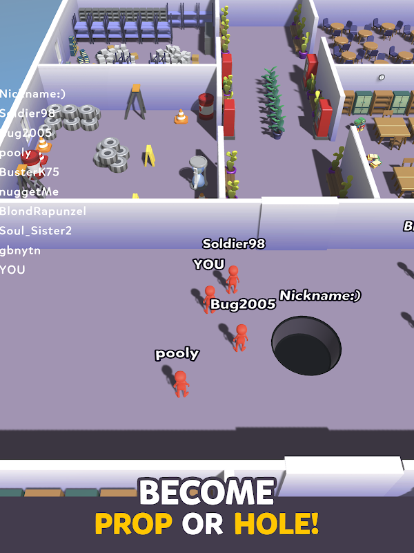 Dalam permainan mudah alih yang mendebarkan ini, anda dan rakan anda akan bertukar menjadi prop atau lubang secara bergilir-gilir, mencabar satu sama lain untuk mencari atau bersembunyi daripada pihak lawan. Dengan setiap pusingan, permainan berubah, memastikan keseronokan dan kejutan yang tidak berkesudahan.