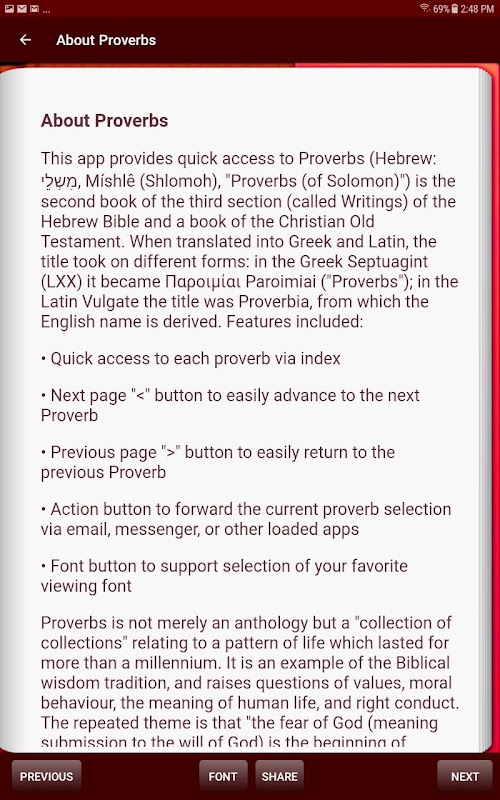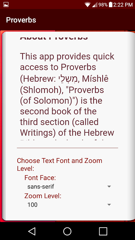 Aplikasi ini menyediakan akses cepat kepada Amsal (Ibrani: מִשְלֵי, Míshlê (Shlomoh), "Amsal (dari Salomo)"), kitab kedua bahagian ketiga (disebut Tulisan) Alkitab Ibrani dan kitab Perjanjian Lama Kristian. Ciri-ciri termasuk: