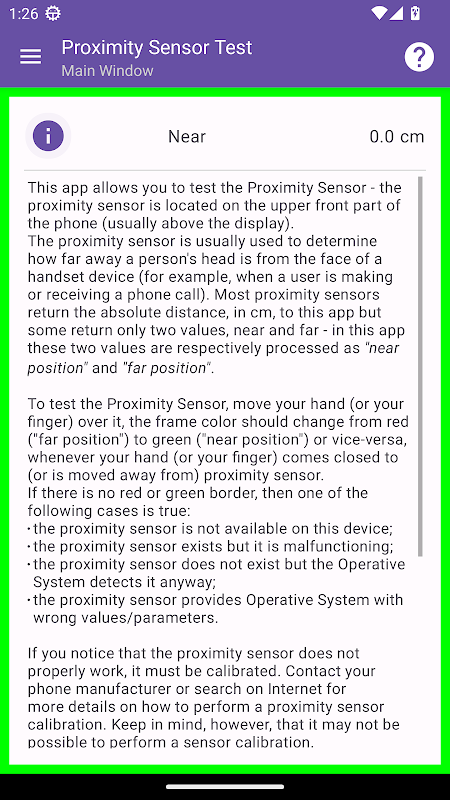 Untuk menguji Sensor Jarak, gerakkan tangan anda (atau jari anda) ke atasnya, warna bingkai harus berubah dari merah ke hijau (atau sebaliknya), apabila tangan anda (atau jari anda) ditutup kepada (atau dipindahkan dari) sensor jarak. Jika tiada sempadan merah atau hijau, maka sensor jarak tidak tersedia pada peranti ini.