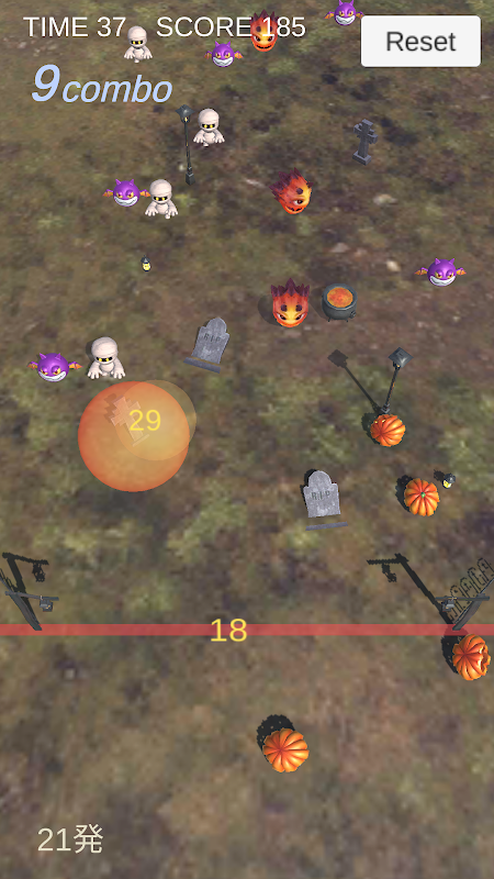Kalahkan musuh yang muncul dalam 1 minit dengan bom labu dan bersaing untuk mendapatkan skor pada masa pembersihan.