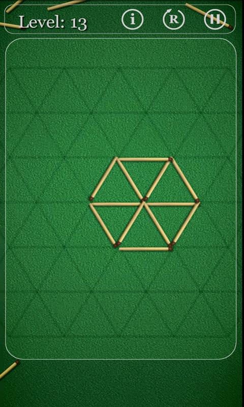 Ia telah menguji minda selama berkurun. Peraturannya mudah: anda lihat rajah pada skrin daripada beberapa batang mancis, tetapi ia tidak sempurna. Gerak, alih atau tambah mancis...dan selesai! Rajah menjadi lengkap (jangan tinggalkan mancis yang tidak digunakan). Sesetengah masalah adalah mudah, dan sesetengah memerlukan penyelesaian yang elegan. Kebanyakan tahap boleh disempurnakan melalui beberapa cara (penyelesaian yang berbeza daripada yang dicadangkan juga diterima). Petua boleh diakses dengan mengklik butang "Penyelesaian" pada menu.