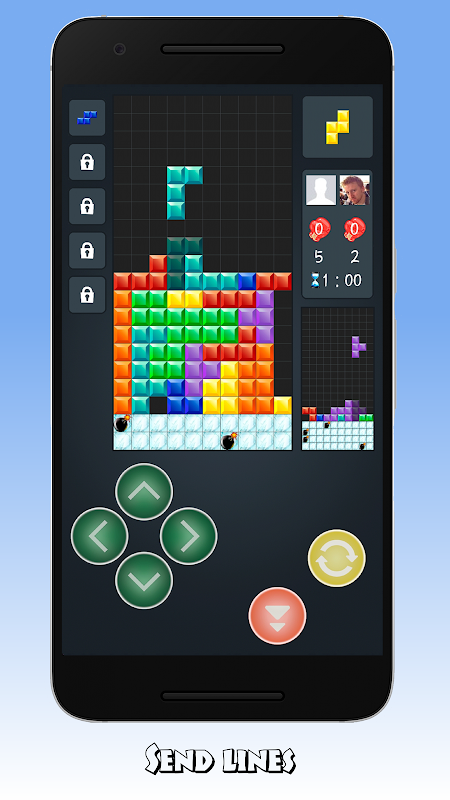 PVP Blocks is a multiplayer version of the block puzzle from the brick game, the distinctive feature of which is that the player influences the difficulty of the opponent’s game, creating combos and sending lines to the enemy, thereby limiting the game area. At the same time, each line contains a bomb, which explodes and removes the line if you lower the figure on it.