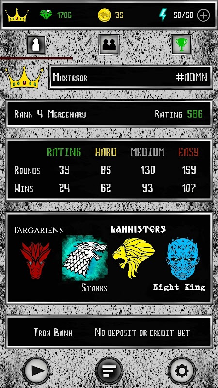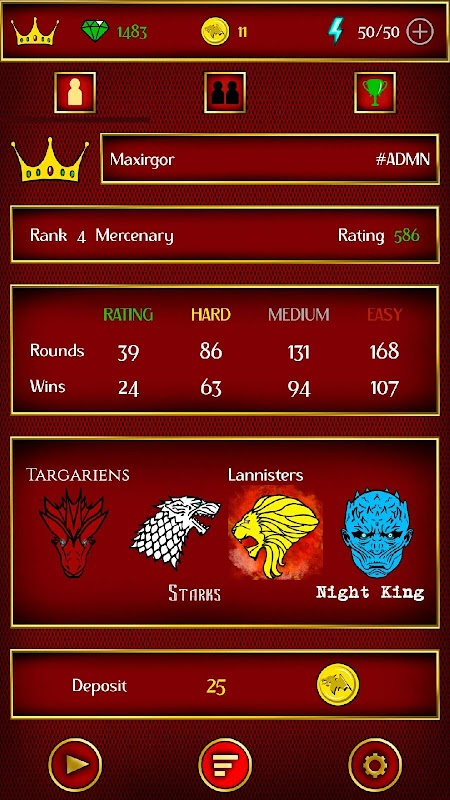 • Tema visual yang berbeza: Lannister, Stark, Targaryen, Raja Malam.