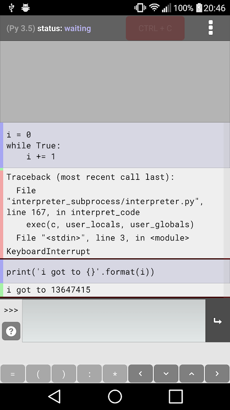 Pyonic jurubahasa adalah antara muka grafik untuk Python juru bahasa pengaturcaraan. Anda boleh menjalankan kod Python dan melihat keputusan seperti pada desktop, dengan beberapa penambahbaikan antara muka pengguna untuk penggunaan mudah alih termasuk butang papan kekunci tambahan, penyiapan secara automatik dan doc pertanyaan.