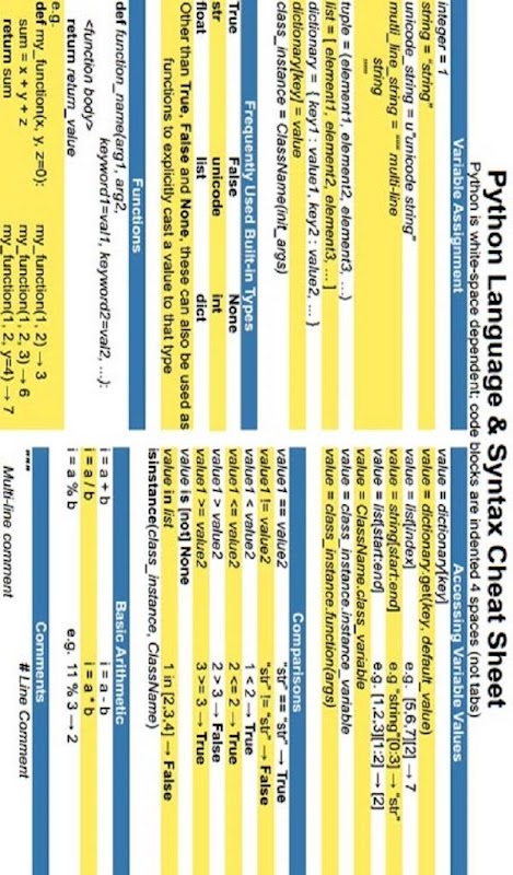 This app is a Quick Reference Guide for Python Programming Language. Learn python coding tutorial. Easy to use python cheat sheet. Learning python hasn't been easier and simpler. Python coding training for everybody.
