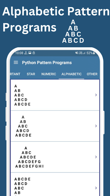 Program Penjanaan Corak: Apl ini menawarkan banyak program penjanaan corak yang memudahkan pengguna memahami logik dan struktur yang penting untuk menghasilkan corak yang menawan menggunakan pengaturcaraan Python.