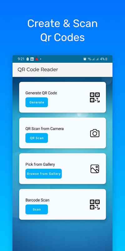 Aplikasi Pengimbas Kod QR & Kod Bar boleh mengimbas dan membaca kod QR yang berbeza, jenis kod bar termasuk teks, url, ISBN, produk, kenalan, kalendar, e-mel dan dengan aplikasi pengimbas qr ini anda juga boleh menjana dan mencipta kod Qr dengan mudah. Hanya klik pada hasilkan kod QR dan masukkan kod qr anda dan aplikasi pembaca kod qr & pengimbas akan mencipta kod qr dan anda juga boleh memuat turun dan berkongsi kod qr & kod bar itu.