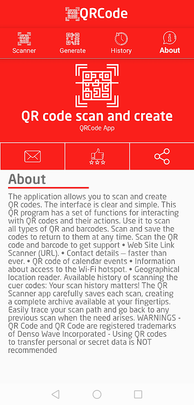 Aplikasi ini membolehkan anda mengimbas dan membuat kod QR. Antara muka adalah jelas dan mudah.