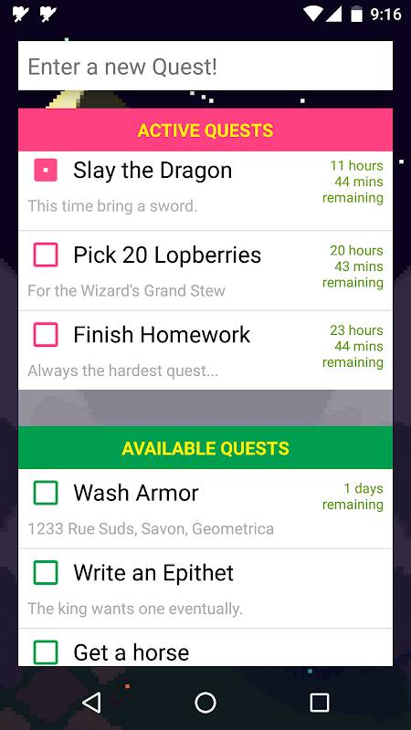 Transform your tasks into glorious Quests! with this RPG-style to-do list. Get in the mood to take on life by immersing yourself in a heroic theme, complete with pixel art and invigorating music. With the option to set quest names, descriptions, and deadlines, it's easy to enter any task into QuestTracker. And with multiple reminders as quest deadlines approach, you'll never forget a quest again.
