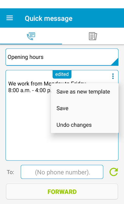 Additionally, our app allows you to define own message templates which are easily editable. The app supports Google voice typing which is very handy when you create many templates with long messages or edit them frequently.