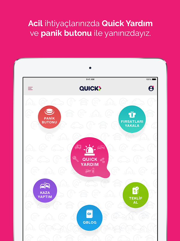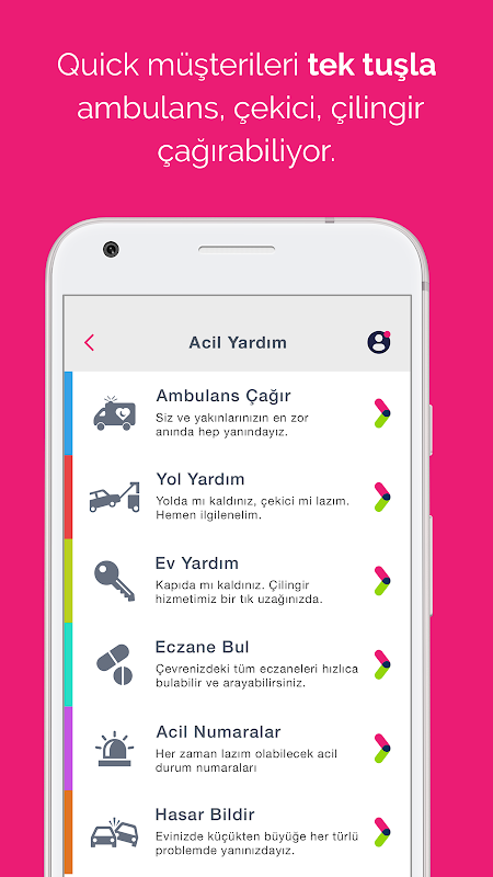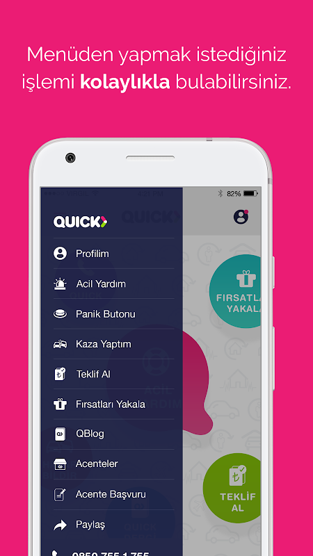 Quick Sigorta mobil uygulaması telefonunuzda “işe yarayan” uygulamalardan olmak için tasarlandı. Mobil uygulamamız ile sizlere internet sayfamızdan sunduğumuz tüm ürünlere ulaşabilirsiniz. Zaten ürünlerimizden birine sahip iseniz o zaman bize ihtiyaç duyduğunuz her an 7/24 tek tuş ile temsilcimize ulaşabilir, Tıbbi danışmanlık alabilir , ambulans , çekici , kurtarıcı isteyebilir, çilingir , camcı , tesisatçı talebinde bulunabilir, size en yakın nöbetçi eczaneyi bulabilir, en yakın anlaşmalı servisleri öğrenebilir ve tüm acil numaralara ulaşabilirsiniz. Üstelik eczane bilgileri GPS destekli. Yani mobil uygulamamız sizi doğruca istediğiniz noktaya yönlendirecek. Kısacası Quick Mobil hayatınızı kolaylaştırmak üzere tasarlandı. Üstelik bizi aramanız gerekmiyor. Sadece istediğiniz hizmetin üstüne basın ve biz size hemen ulaşalım. Siz desteğe ihtiyacınız olduğunda numara aramakla uğraşmayın. Mobil uygulamamızın tüm özelliklerinden tam olarak yararlanmanız için sisteme giriş yapmanızı öneriyoruz.