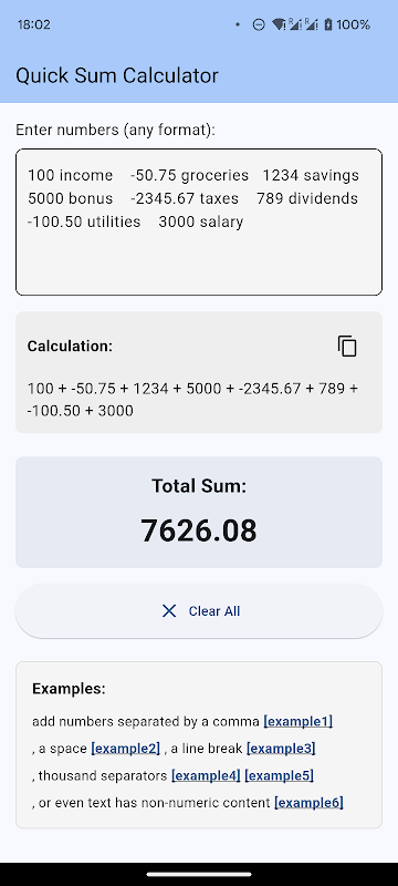 Kalkulator pintar untuk jumlah pantas dengan format input fleksibel & pembetulan ralat.