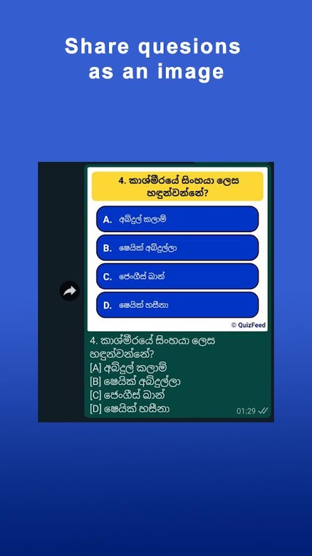 Quiz feed is not limited to narrow range of questions. It spreads to a broad range od questions which are from History of Sri Lanka, History of world, Technology, Science, Innovations, Art, Geography, Current affairs, Agriculture etc.